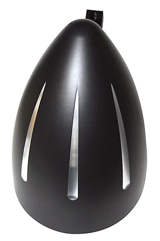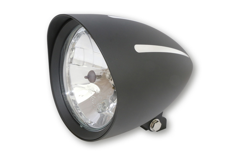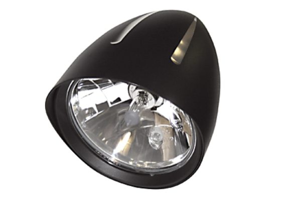 H4-Halogen-Hauptscheinwerfer mit einem hochwertig verarbeiteten, schwarzen Aluminium-Gehäuse mit 3 markanten, CNC-gefrästen Rillen sowie einem nostalgischen Schirm (Länge: ca. 25 mm) im Retro-Look. Der Scheinwerfer verfügt über einen asymmetrischen – nur für den Rechtsverkehr zugelassenen – Prismenreflektor und Standlicht, E-geprüft.
