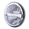 Dieser runde, verchromte Reflektor mit klarem Glas verfügt über eine Fern-, Abblend-, Stand- und Tagfahrlicht-Funktion. Dabei sind Tagfahr- und Positionslicht in einer mittigen Leiste verbaut, sodass optisch ein sehr schönes Lichtbild entsteht – das Abblendlicht leuchtet oberhalb der Leiste, das Fernlicht entsprechend unterhalb. Der Reflektor strahlt einen asymmetrischen – nur für den Rechtsverkehr zugelassenen – Lichtstrom aus, E-geprüft.