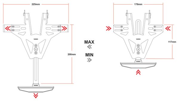 Die Blinkerhalterungen des HIGHSIDER AKRON-RS sind in der Breite verstellbar und damit für jede Art von Zubehör-Blinkern geeignet. Durch diese Verstellmöglichkeit kannst Du die Position für Deine Blinker den unterschiedlichsten Kennzeichen anpassen. Um die Montage der Blinker ohne Trennung vom Kabelbaum zu ermöglichen, sind die 10 mm Bohrungen zur Seite hin geschlitzt.