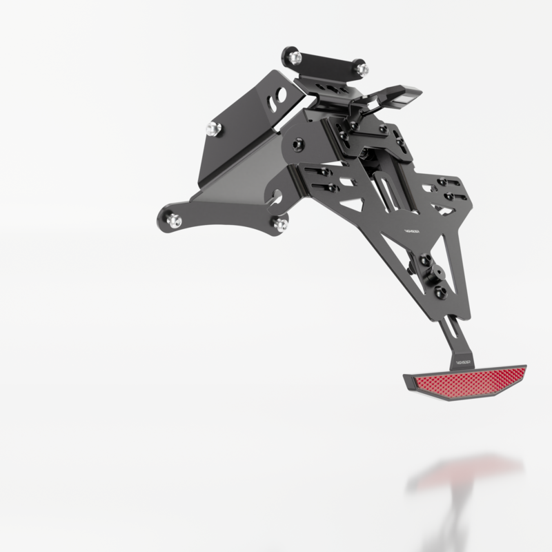 Modellspezifischer Kennzeichenhalter inkl. Kennzeichenleuchte + Rückstrahler. Gefertigt aus schwarz pulverbeschichtetem Stahl und mit stufenlos verstellbarem Neigungswinkel. Inkl. Anbauteile, keine Eintragung beim TÜV erforderlich.