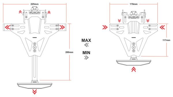 Die Blinkerhalterungen des HIGHSIDER AKRON-RS PRO sind in der Breite verstellbar und damit für jede Art von Zubehör-Blinkern geeignet. Durch diese Verstellmöglichkeit kannst Du die Position für Deine Blinker den unterschiedlichsten Kennzeichen anpassen. Um die Montage der Blinker ohne Trennung vom Kabelbaum zu ermöglichen, sind die 8 mm Bohrungen zur Seite hin geschlitzt.