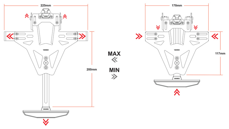 Die Blinkerhalterungen des HIGHSIDER AKRON-RS PRO sind in der Breite verstellbar und damit für jede Art von Zubehör-Blinkern geeignet. Durch diese Verstellmöglichkeit kannst Du die Position für Deine Blinker den unterschiedlichsten Kennzeichen anpassen. Um die Montage der Blinker ohne Trennung vom Kabelbaum zu ermöglichen, sind die 8 mm Bohrungen zur Seite hin geschlitzt.