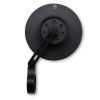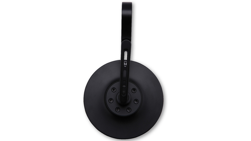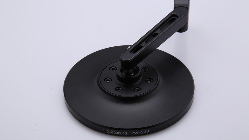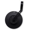 CNC-gefräster Lenkerendenspiegel mit einem runden Kopf aus eloxiertem Aluminium in Schwarz matt. Der Spiegelarm ist mit drei stylischen Luftschlitzen versehen und durch ein Gelenk an der Schelle gibt es zusätzliche Einstellmöglichkeiten für eine gute Sicht.