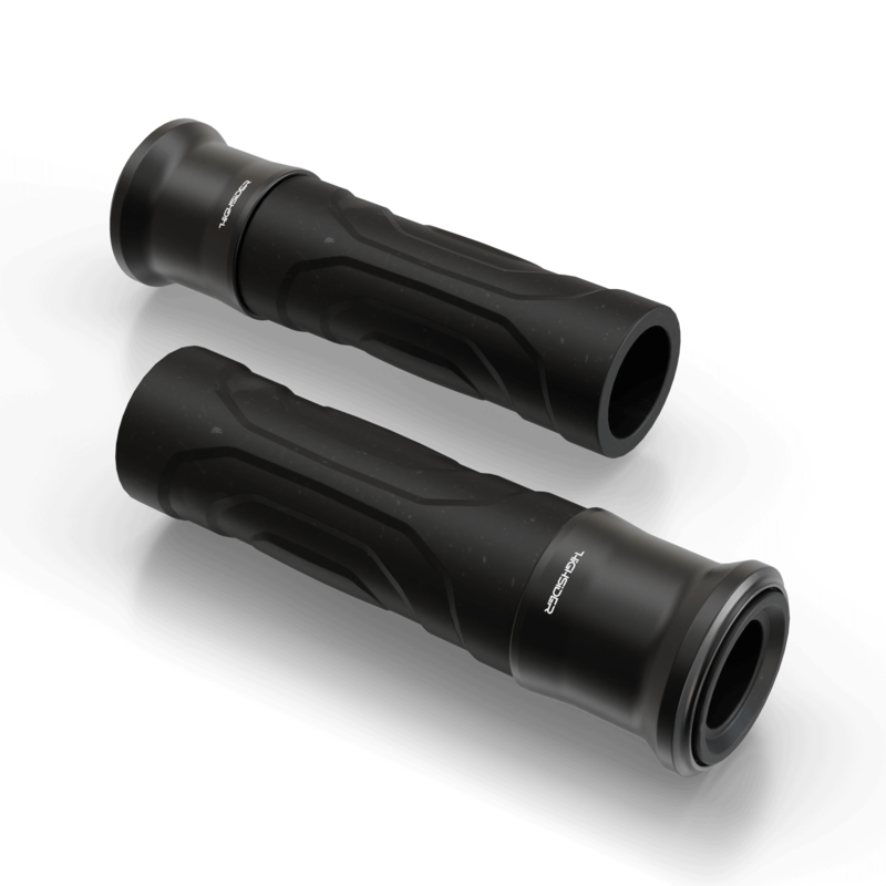 Steil und flach verlaufende Trapeze bilden die Grundform der aus Aluminium CNC gefertigten Griffhülsen der HIGHSIDER ESAGANO-RS Griffe und schaffen ein futuristisches Design, das damit die Formensprache moderner Motorräder versinnbildlicht. Die markante Griffhülse wird mit unserem neuen ergonomischen Griffgummi und seinem modernen topografischem Design vervollständigt. Zusammen sorgen sie für ein überzeugendes griffiges Ergebnis sowohl im Handling als auch optisch und eignen sich für 7/8 Zoll Lenker. Der Aufgestellte Kragen der Griffhülse sorgt für einen homogeneren Übergang zu den Lenkerarmaturen und gibt dies auch haptisch an deine Hände weiter. Den Abschluss des offenen Lenkerendes kannst du über die beiliegenden schlichten schwarzen Abdeckkappen verschließen. Wenn du einen selbstbewussteren Abschluss im stimmigen Design suchst bieten wir dir mit den Lenkerenden der ESAGANO-Serie oder aus unserem umfassenden HIGHSIDER Produktsortiment eine attraktive Alternative, die dein Bike in Perfektion vollenden und es gekonnt in Szene setzen.