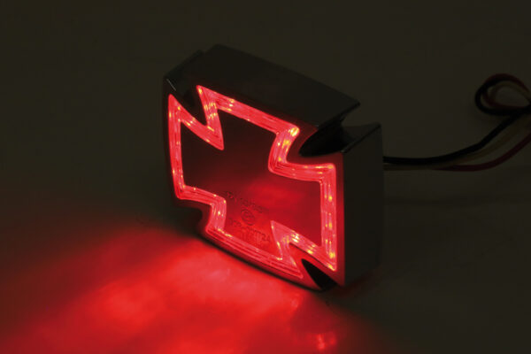 Rücklicht mit Power-LED in einem Kunststoff-Gehäuse im Kreuz-Design und Klarglas-Linse, E-geprüft.