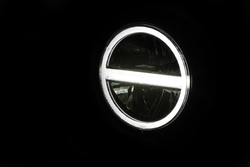 Der robuste, puristisch geformte Hauptscheinwerfer mit matt schwarzem Metallgehäuse verfügt über Fern-, Abblend- und Standlicht.