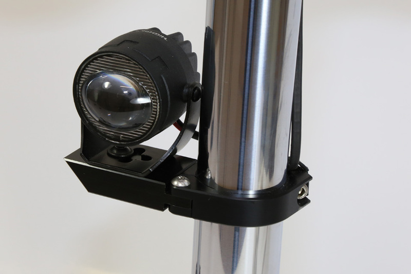 Schwarz-eloxierter Halter aus CNC-gefrästem Aluminium, z. B. zur Montage eines HIGHSIDER SATELLITE Fern- oder Abblendscheinwerfers.