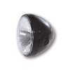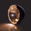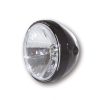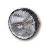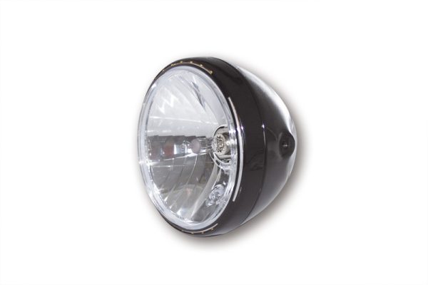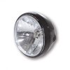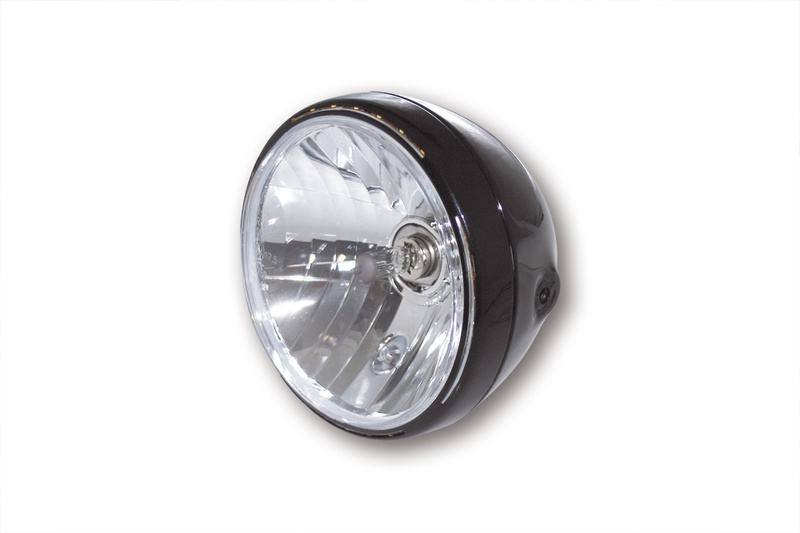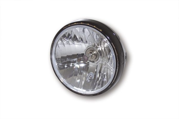 7 Zoll Hauptscheinwerfer mit LED Positionsleuchte im Lampenring. H4 Prismen Reflektor in einem schwarzen oder verchromten Metallgehäuse mit seitlicher M8 Befestigung. E-geprüft.