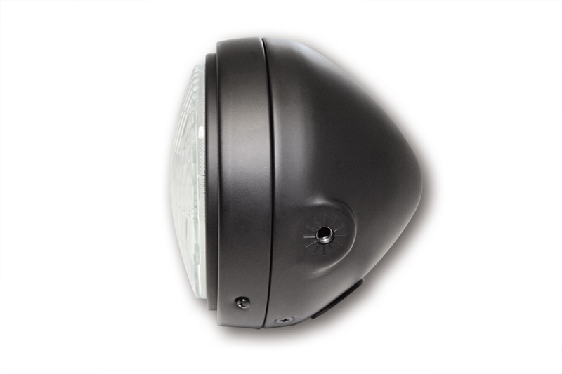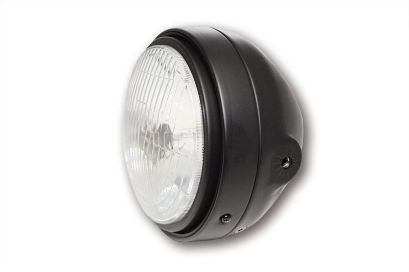 H4-Hauptscheinwerfer in einem matt-schwarzen Metallgehäuse mit einstellbarem Innenring und geriffeltem Glas. Der Scheinwerfer verfügt über einen asymmetrischen – nur für den Rechtsverkehr zugelassenen – Reflektor und Standlicht, E-geprüft.