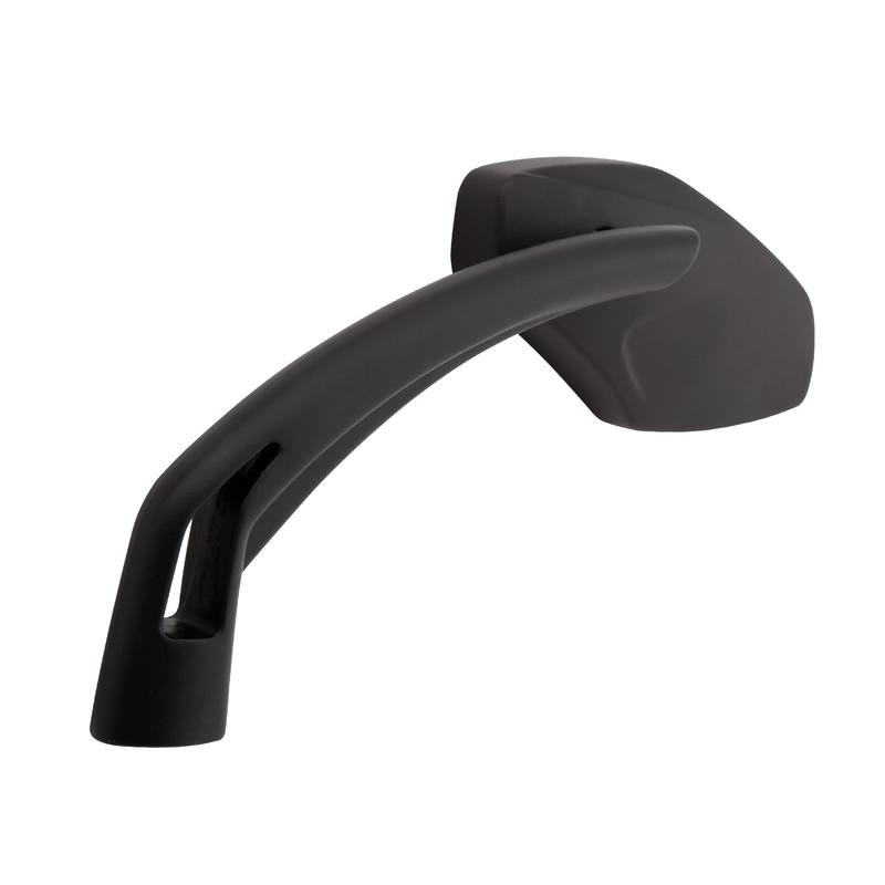 Hochwertig verarbeiteter, Aluspiegel mit einem gebogenem Spiegelarm, der am unteren Ende mit einer Aussparung versehen ist.