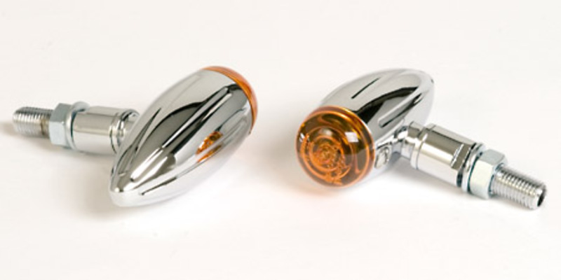 Klassischer, formschöner Mini-Blinker mit verchromtem Aluminium-Gehäuse und gelber Linse.