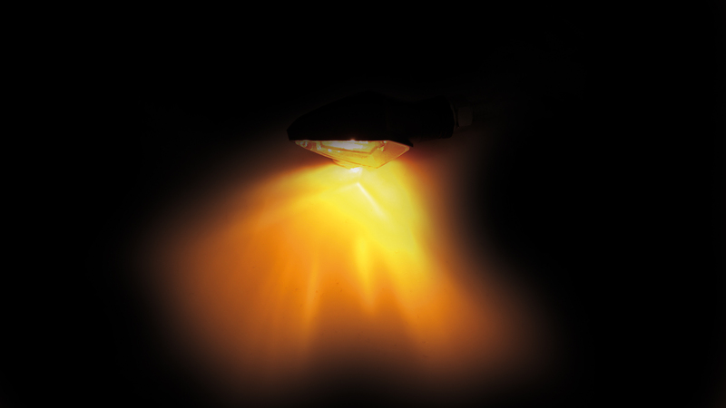 Halogen Blinker mit rubustem Kunststoffgehäuse in Schwarz und gelbem Glas, E-geprüft.