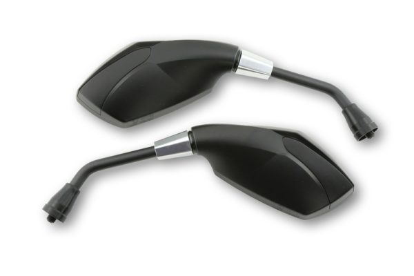 Sportlich geschnittener Lenkerspiegel in Schwarz. Aufgrund der großen Spiegelfläche bietet das Modell eine gute Sicht nach hinten, E-geprüft.