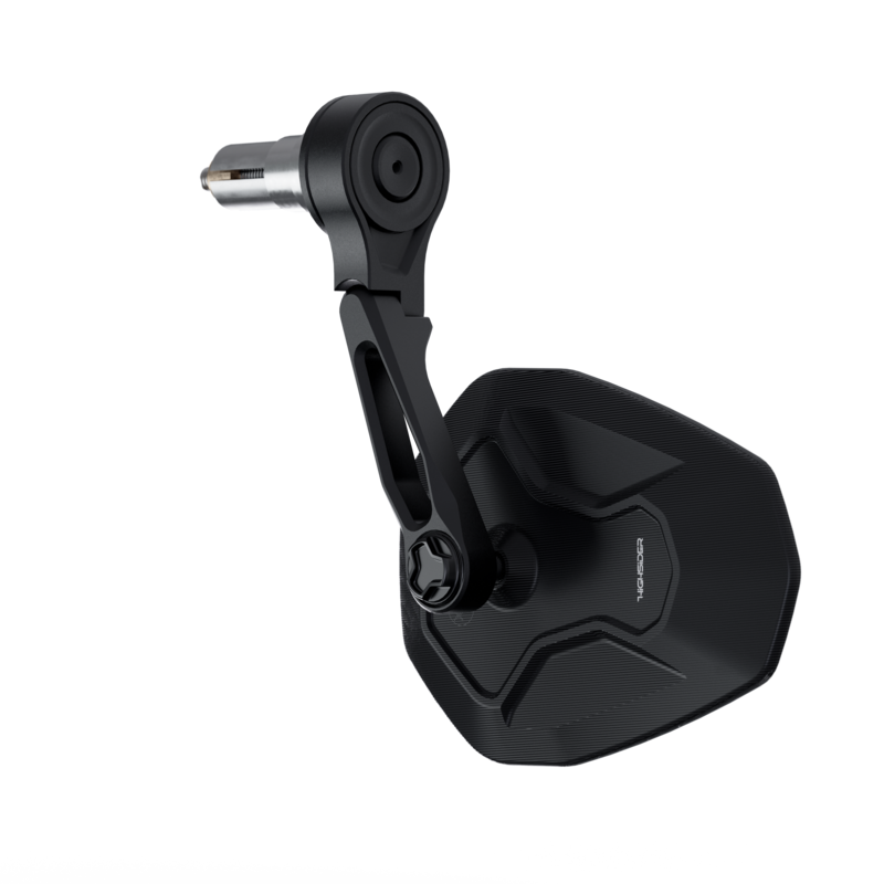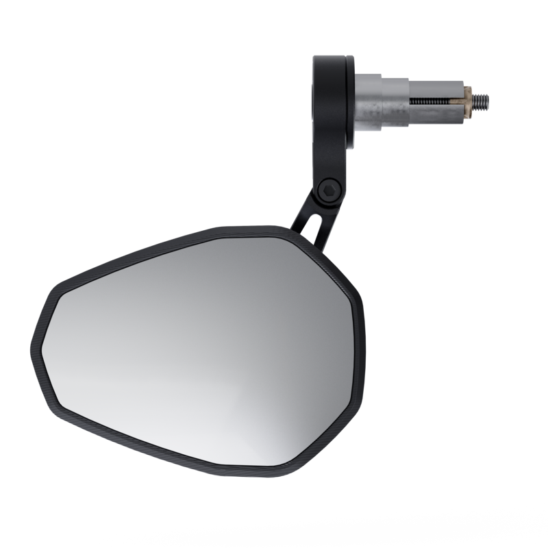 Kurzer, E-geprüfter Lenkerendenspiegel aus perlgestrahltem Aluminium mit großem Verstellbereich. Der Spiegel kann sowohl stehend als auch hängend am Lenker montiert werden.