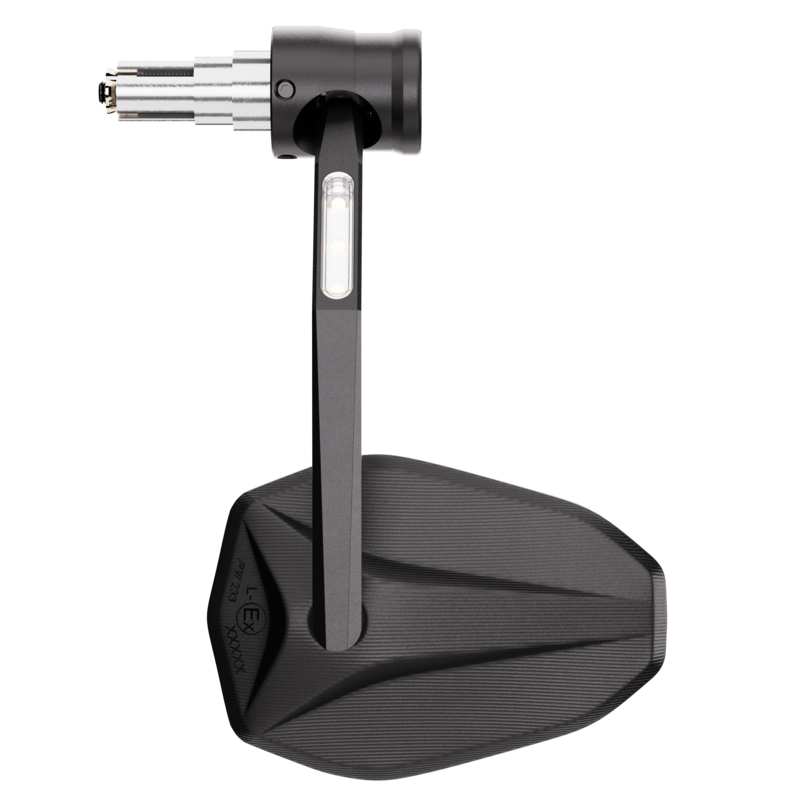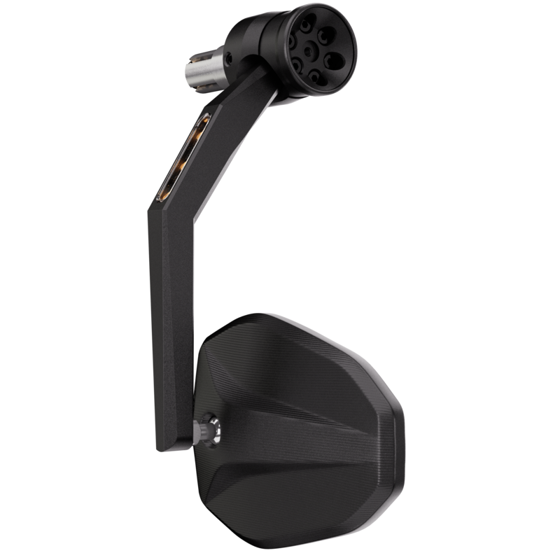 Die neuen Details des aufgefrischten Produkts zeigen sich erst auf den zweiten Blick. Das – Bar end System – wurde markanter gestaltet und ist für ein noch individuelleres Auftreten, optional erweiterbar mit dem Design Cap1 aus gleichem Hause. Das überarbeitete Spiegelarm-Design mit volleingelassenem Blinker steht nun noch selbstbewusster im Wind. Das matt-schwarze, eloxierte Aluminium, fein perlengestrahlt und die aufwändige CNC gefräste Oberfläche mit Rillen unterstreicht den wertigen Look.