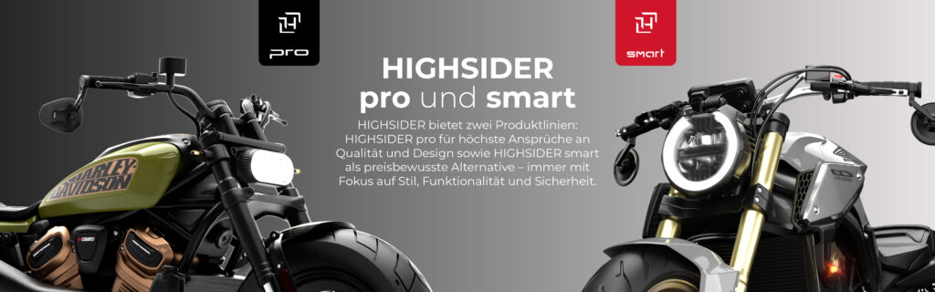 Für dich, wenn du nach einer kostengünstigeren Option suchst, ohne dabei auf Stil und Funktionalität verzichten zu müssen, haben wir HIGHSIDER Smart. Diese Linie kombiniert durchdachtes Design mit einem attraktiven Preis-Leistungs-Verhältnis. Mit HIGHSIDER Smart kannst du dein Motorrad stilvoll aufrüsten, ohne dein Budget zu sprengen.