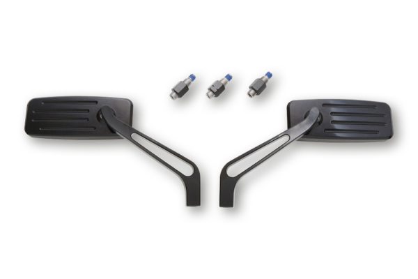 Hochwertig verarbeiteter, CNC-gefräster Spiegel in rechteckiger Form mit einem schwarz-eloxierten Kopf aus Aluminium. Inklusive extra Adapter M10 x 1,25 mm mit Linksgewinde für Yamaha.