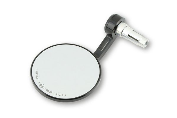 CNC-gefräster Lenkerendenspiegel mit einem runden Kopf aus schwarz eloxiertem Aluminium. Kombiniert mit polierten Fasen steht dieses Modell für ein edles, stilvolles Design. Geeignet für Lenker mit einem Innendurchmesser von 12 bis 22 mm. Also für die meisten 7/8 Zoll und 1 Zoll Alu-, oder Stahllenker. Ideale Sicht durch ein gewölbtes Glas mit einer leichten Tönung. Der Spiegel ist links und rechts verwendbar.