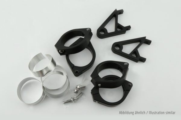 Die Halter aus CNC-gefrästem Aluminium sind so an den Schellen befestigt, dass sie auf die Scheinwerferbreite eingestellt werden können. Die Aufnahme zur Blinkerbefestigung ist geeignet für Gewindebolzen bis Größe M10. Mit beiliegenden Einlegestreifen kann der Durchmesser reduziert werden. Wählen Sie die gewünschte Farbe und Größe aus.