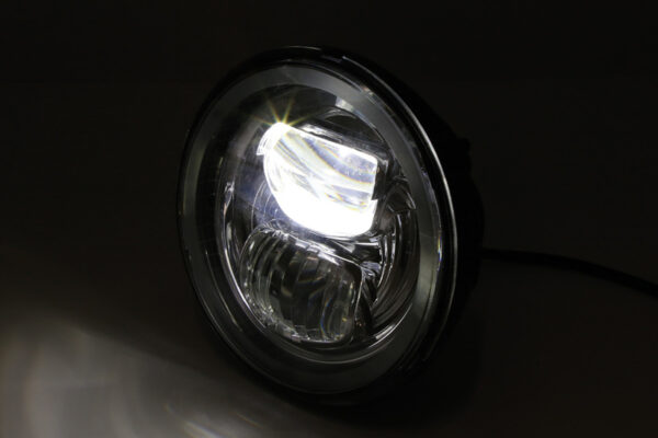Dieser runde, schwarze oder verchromte Reflektor verfügt über Fern-, Abblendlicht und Standlichtring. Das Abblendlicht leuchtet in der oberen Hälfte vom Einsatz und bei eingeschaltetem Fernlicht leuchten beide Hälften.
