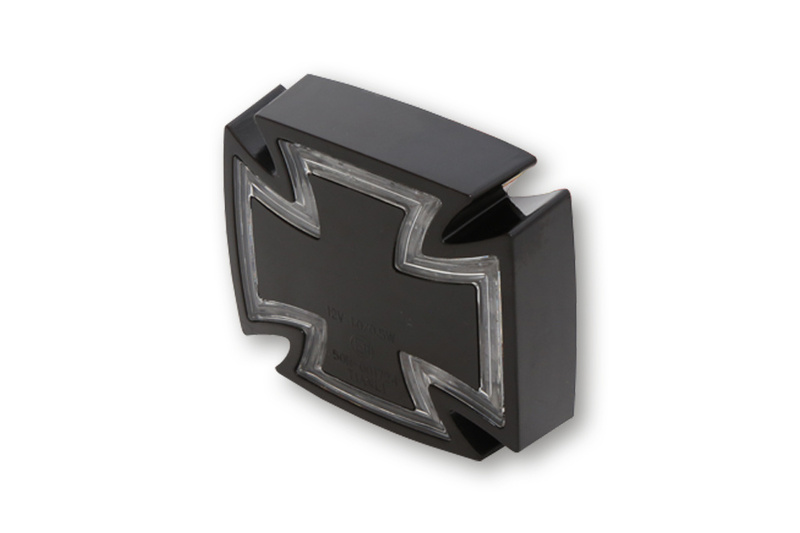 Rücklicht mit Power-LED in einem Kunststoff-Gehäuse im Kreuz-Design und Klarglas-Linse, E-geprüft.
