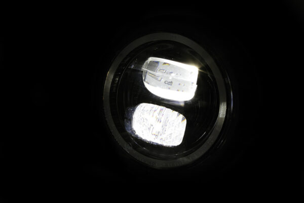 Das Besondere an diesem LED-Scheinwerfer ist die dunkle Optik dank matt schwarzem Gehäuse und dem unauffälligen Reflektor in Schwarz, sowie sein Standlichtring.