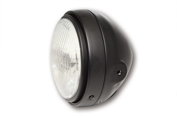 H4-Hauptscheinwerfer in einem matt-schwarzen Metallgehäuse mit einstellbarem Innenring und geriffeltem Glas. Der Scheinwerfer verfügt über einen asymmetrischen – nur für den Rechtsverkehr zugelassenen – Reflektor und Standlicht, E-geprüft.