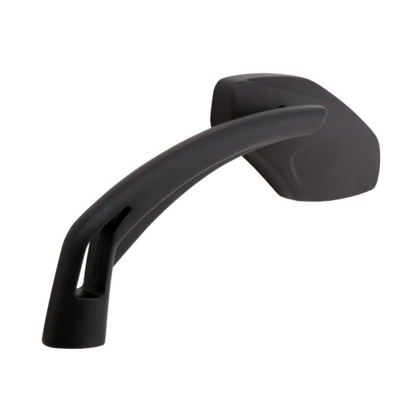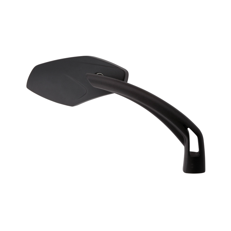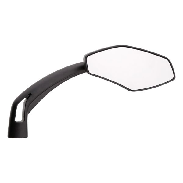 Hochwertig verarbeiteter, Aluspiegel mit einem gebogenem Spiegelarm, der am unteren Ende mit einer Aussparung versehen ist.